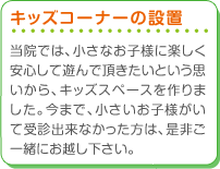 お子様連れの患者様も安心して診察していただけるよう、キッズスペースを設けました。